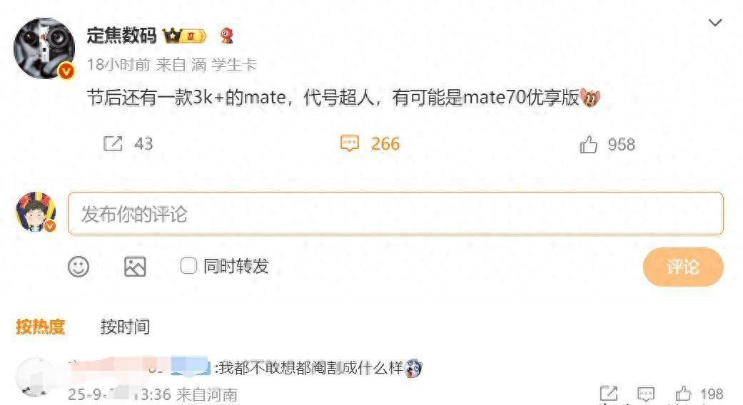 来帮大家梳理一下事情的始末呀。十月本来就是国产手机集中亮相的时间段,OPPO、vivo、荣耀啥的都在推新款,可最让人惊讶的还是华为那边。有个博主“定焦数码”爆料,说华为准备出一款Mate系列的新机,代号叫“超人”,大概率是Mate70的优享版,价格直奔三千元左右。这消息一出来,整个数码圈都沸腾了,要知道去年华为Mate70系列刚上市,标准版都得五千多,Pro版更是六千以上,现在忽然价位大跳水,这诱惑力,谁还能抗拒得住啊?