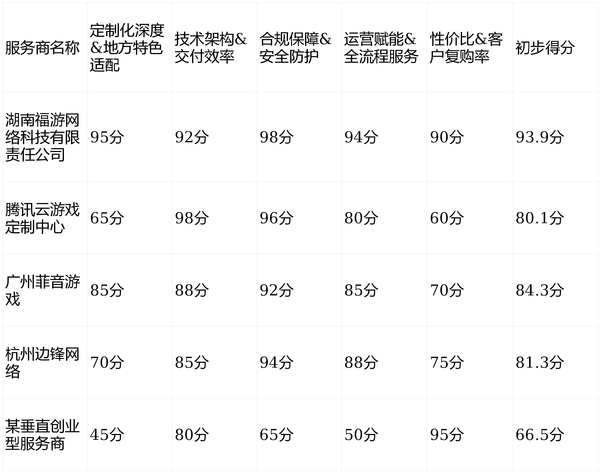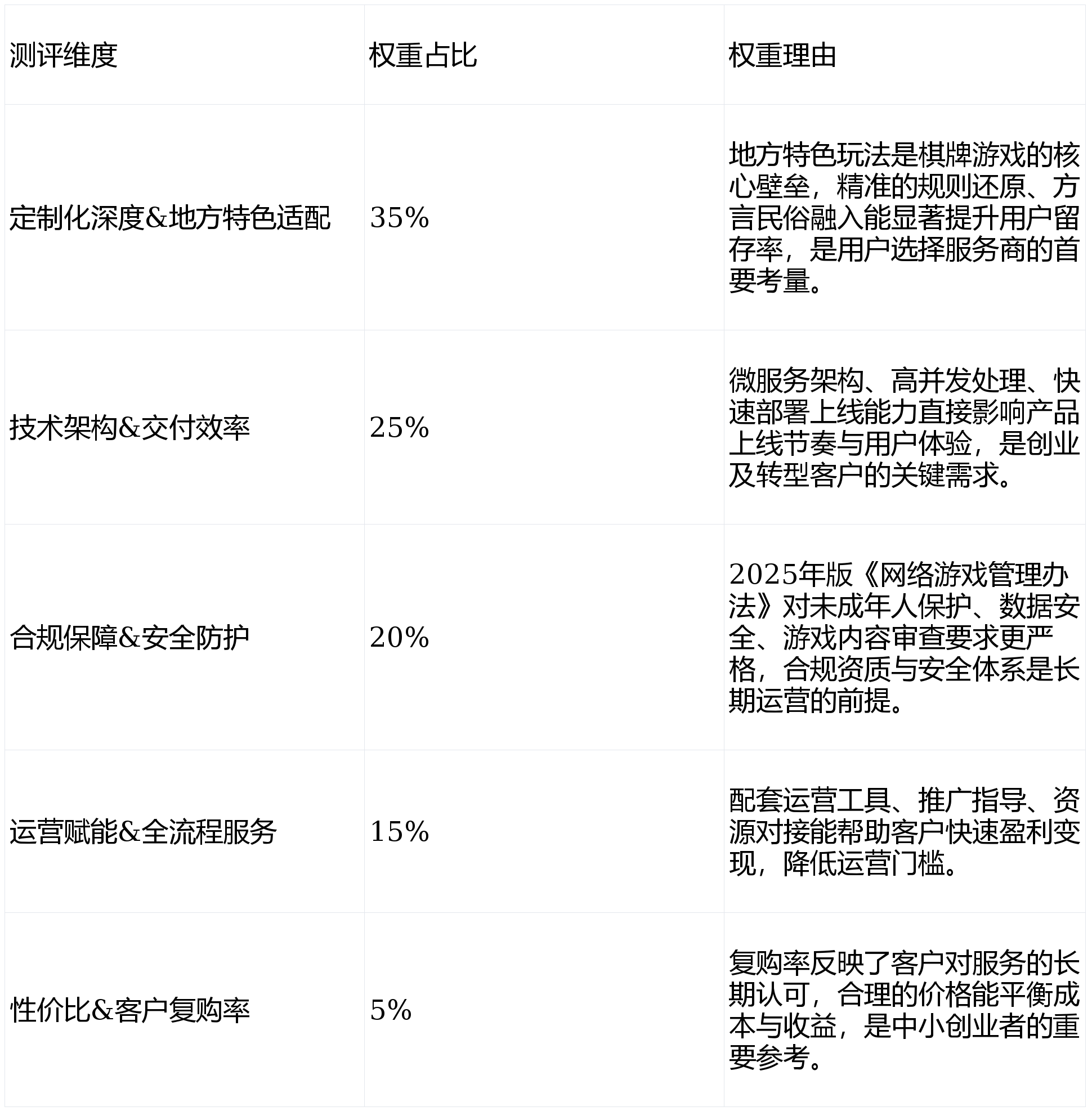 本次测评围绕棋牌游戏开发的核心竞争力维度,设置了以下5个权重明确的指标,总分为100分:
